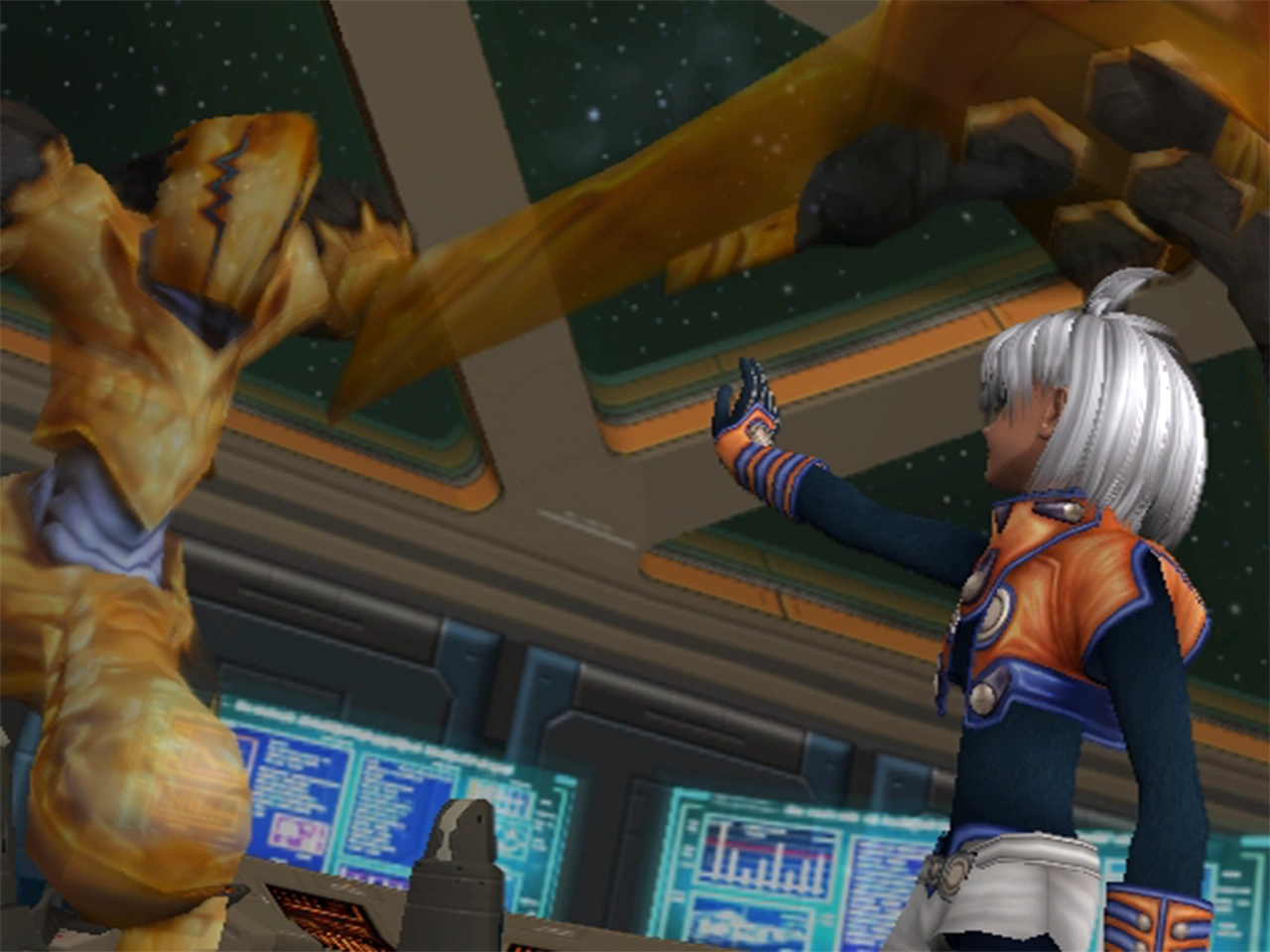 At an unknown time after his military service to the Federation, chaos joined the Elsa Crew two years prior to the events of Episode I. He ensures the safety of the crew during their travels as protection against the Gnosis. In that respect, it could be said that chaos is ship security, as he certainly serves that function. But he also serves in many other ship tasks, such as several in-flight functions and the moving of cargo. Essentially, he is a jack-of-all-trades.