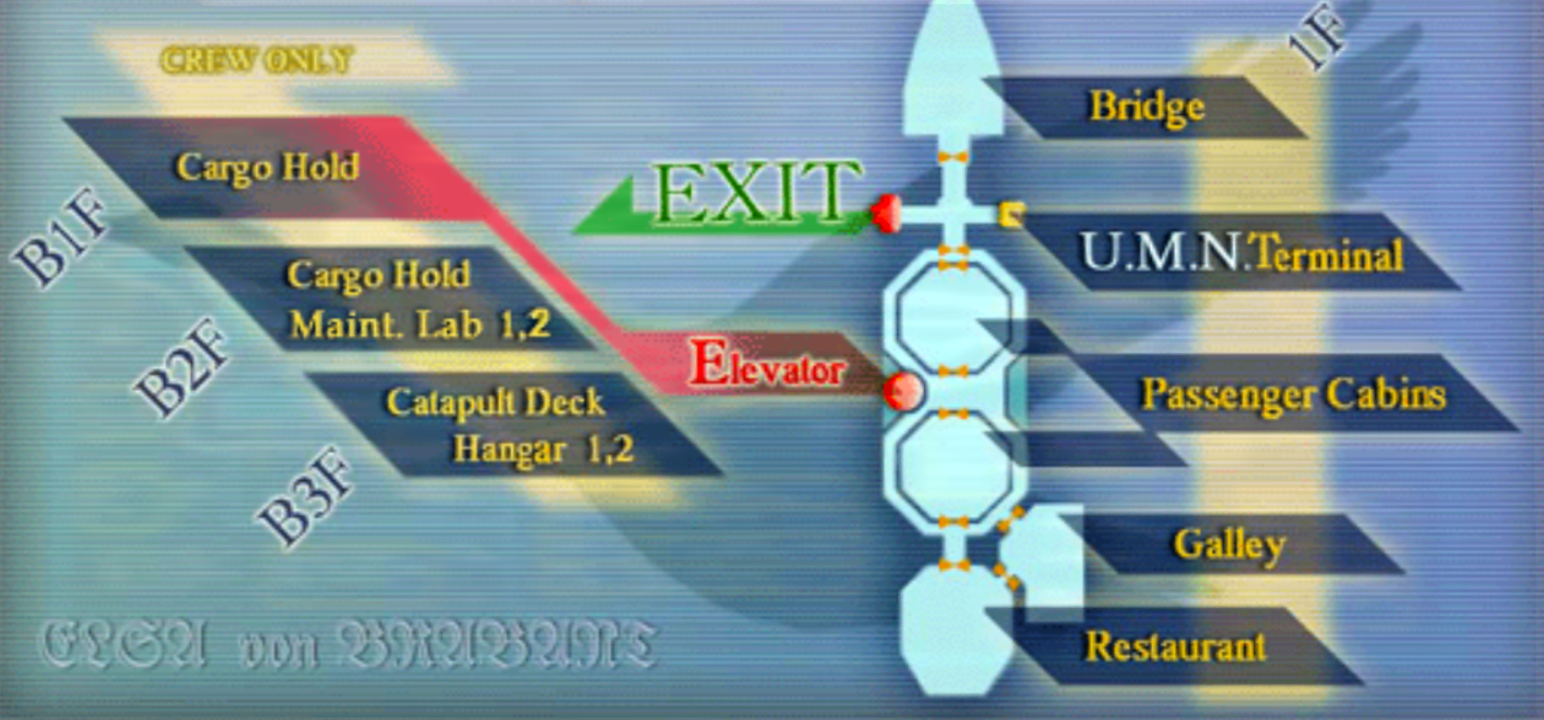 After landing on Second Miltia, it was refurbished to add alterations to the structure and internal layout of the ship. In particular, the A.G.W.S. hangar on the bottom of the ship was enlarged to where it could maintain several E.S.s at once. This remodeling was headed up by the Professor.