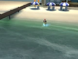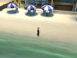 Allen encourages Shion to set her work down for a while and enjoy the beach. Allen, MOMO, and Shion discuss KOS-MOS' unknown programming aspects (black box), and then discuss rumors of how Gaignun and Jr. are related. Jr. overhears this and interrupts the conversation; Allen changes the topic to the beach itself, which Jr. explains is the latest product they've developed.