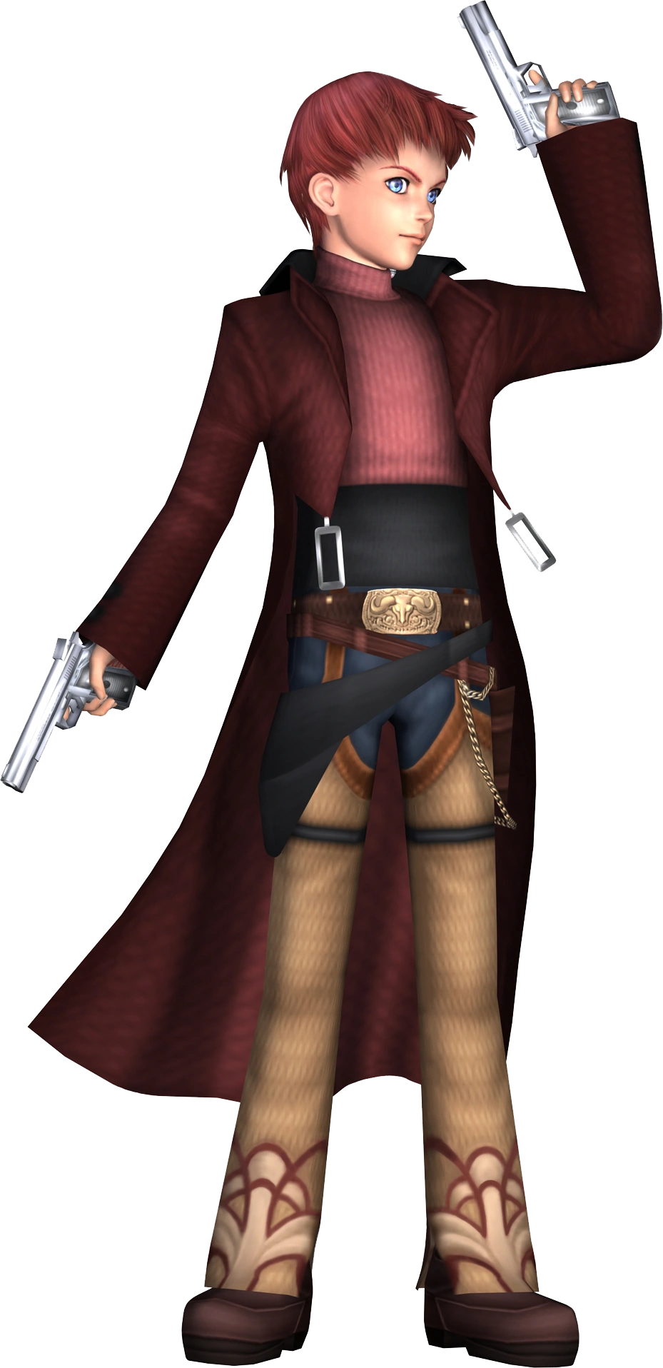 Jr. is a master of gunplay, especially with pistols, and enjoys fighting akimbo. At the beginning of Xenosaga Episode I, Jr. carries a pair of Rook Company pistols. Later, however, and in Episode II he wields two antique Makarov pistols, which are mistranslated as "Makalov" in the English version, likely due to the lack of the "r" in Japanese.