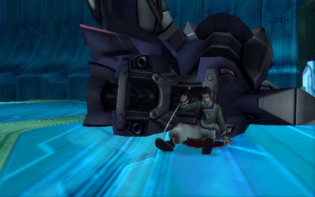 Jin then flies Asher back to the chamber of Zarathustra and joins KOS-MOS in the battle against the Gnosis. He is forced to self-destruct Asher to destroy a Gnosis that managed to maim KOS-MOS, and then proceeds to fight on foot until he is impaled from above by a sword dropped by an enemy. Obviously mortally wounded, he assures chaos that he is fine, and urges them to continue. In an act of defiance, he pulls the sword out of his body and uses it to attack the same Gnosis that impaled him. Though he manages to kill the Gnosis, he is stabbed in the same action.