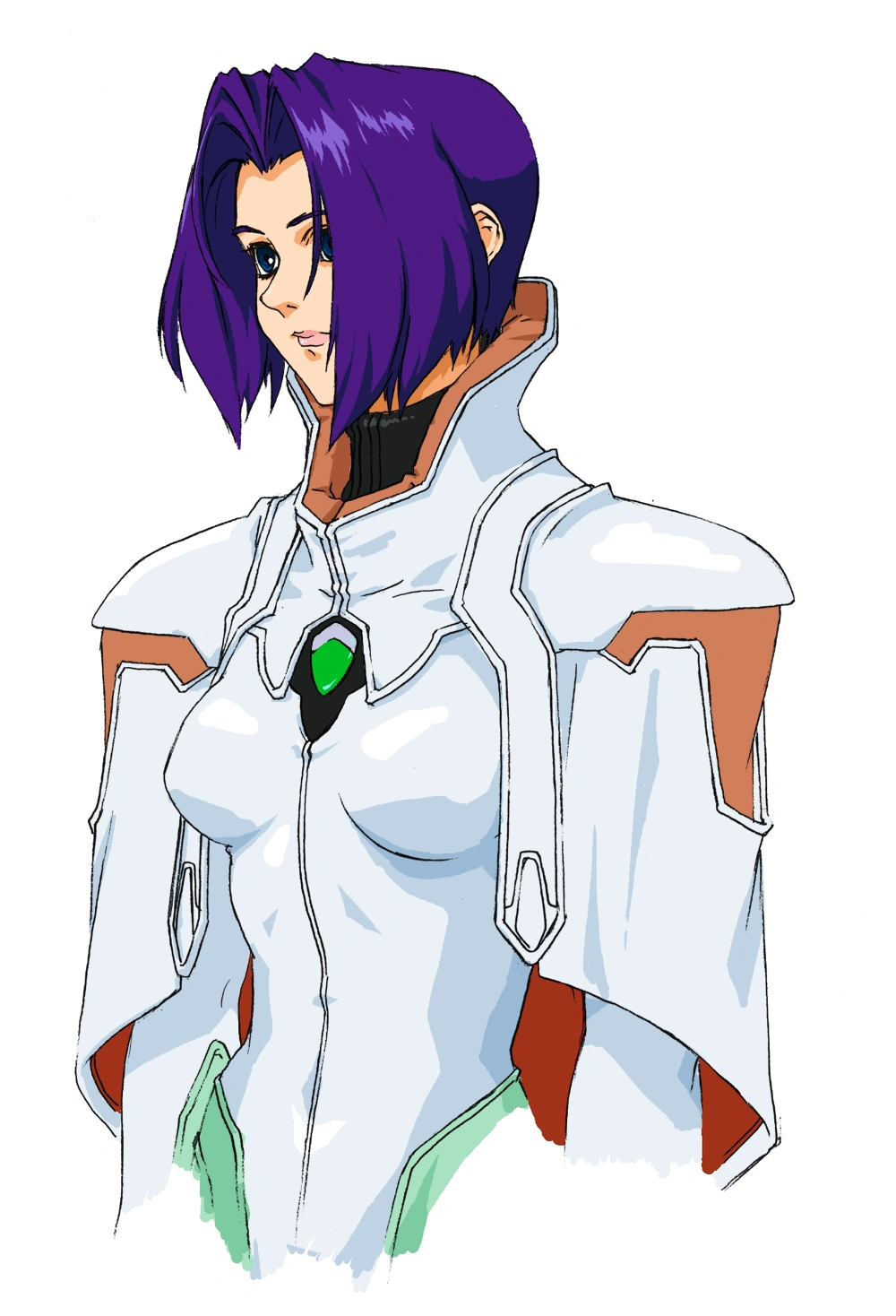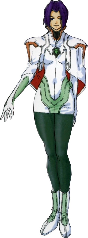 Her main outfit is a white Gebler military uniform, with light green accents on her sleeves, skirt, and boots, with a matching green gem at the center. The top part of her uniform along her neck and collarbone is black.