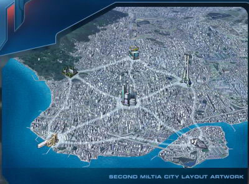 Second Miltia has its own government that is separate from that of the Galaxy Federation, with Helmer at the helm. The U.M.N. Control Center, Vector Industries's Second R&D Division, and many spaceports dot the skyline of the planet's capital.