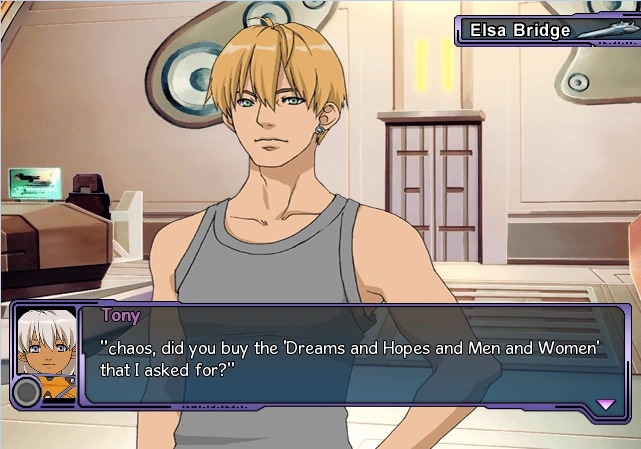 - In XenoComi, when chaos asks everyone if they need anything while he's making a shopping list, Tony requests "money, women, and fame". chaos says none of those are sold on the Foundation, and Tony requests cigarettes instead (タバコ ) . Later on, Tony asks chaos if he got the "hopes and dreams and men and women" that he'd previously asked for (「ケイオス、頼んでた夢と希望と男と女、買ってきてくれた?」).