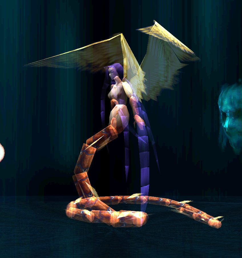 Karellen, wishing to know the true nature of human kind, puts Fei Fong Wong through one final test, this time against a form of Myyah as the 'Urobolus'. In this form, she is half human and half serpent, with angelic wings. Fei fights her in Xenogears. The music that plays is "One who Bares Fangs at God".