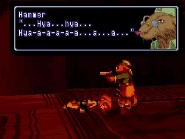 Fei and his allies then decide to collect Anima Relics before Solaris's remaining forces do, as they can transform Gears into Omnigears. After exploring Anima Dungeon One and Anima Dungeon Two, Hammer appears as a monstrous Wel-Gear hybrid, having been transformed by Karellen. After Hammer is defeated and falls to his death, Elly feels powerless at being unable to help him. As Fei watches Elly cry, he resolves that he could no longer risk her heart being broken again.