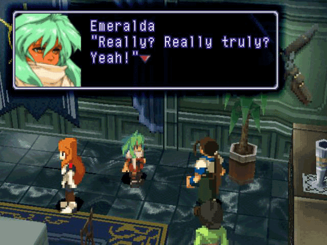 In Solaris, the group discovers that Solaris is actually a futuristic dystopia in the sky, using organizations like the Ethos to funnel resources from the surface, including slaves. Citan soon reveals himself to be Hyuga Ricdeau, a spy who has been working for Emperor Cain, the leader of Solaris. The party also learns that the Gazel Ministry seeks to revive Deus and achieve eternal life, while Karellen seeks to obtain Elly, as she is needed to resurrect Deus. However, Citan secretly releases Fei and his friends as Cain was actually against the Ministry's plans.